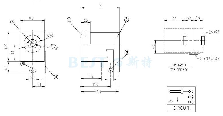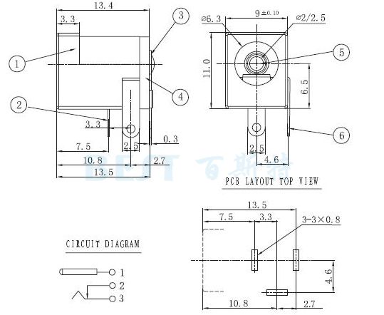 DC電源插座DC-005額定值是DC30V0.5A,插入力度是3到20N,是插件DC電源插座,針芯直徑2.0/2.5,DC插座的孔徑尺寸是6.4mm.3個(gè)插腳。壽命5000次,具體參考DC-005的圖紙說明。